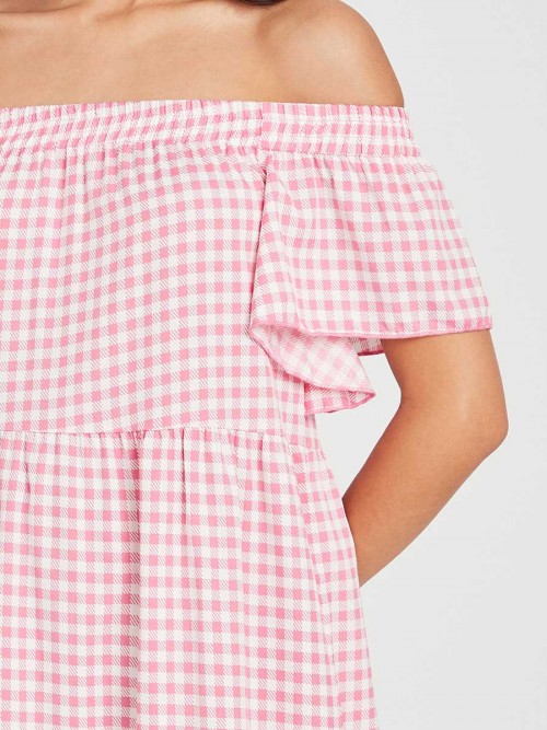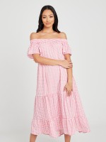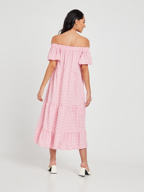 Off Shoulder Gingham Check Print A-Line Tiered Midi Dress