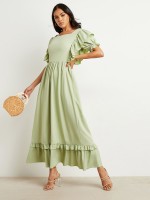 Ruffled Panel A-Line Maxi Dress with Concealed Zipper Closure